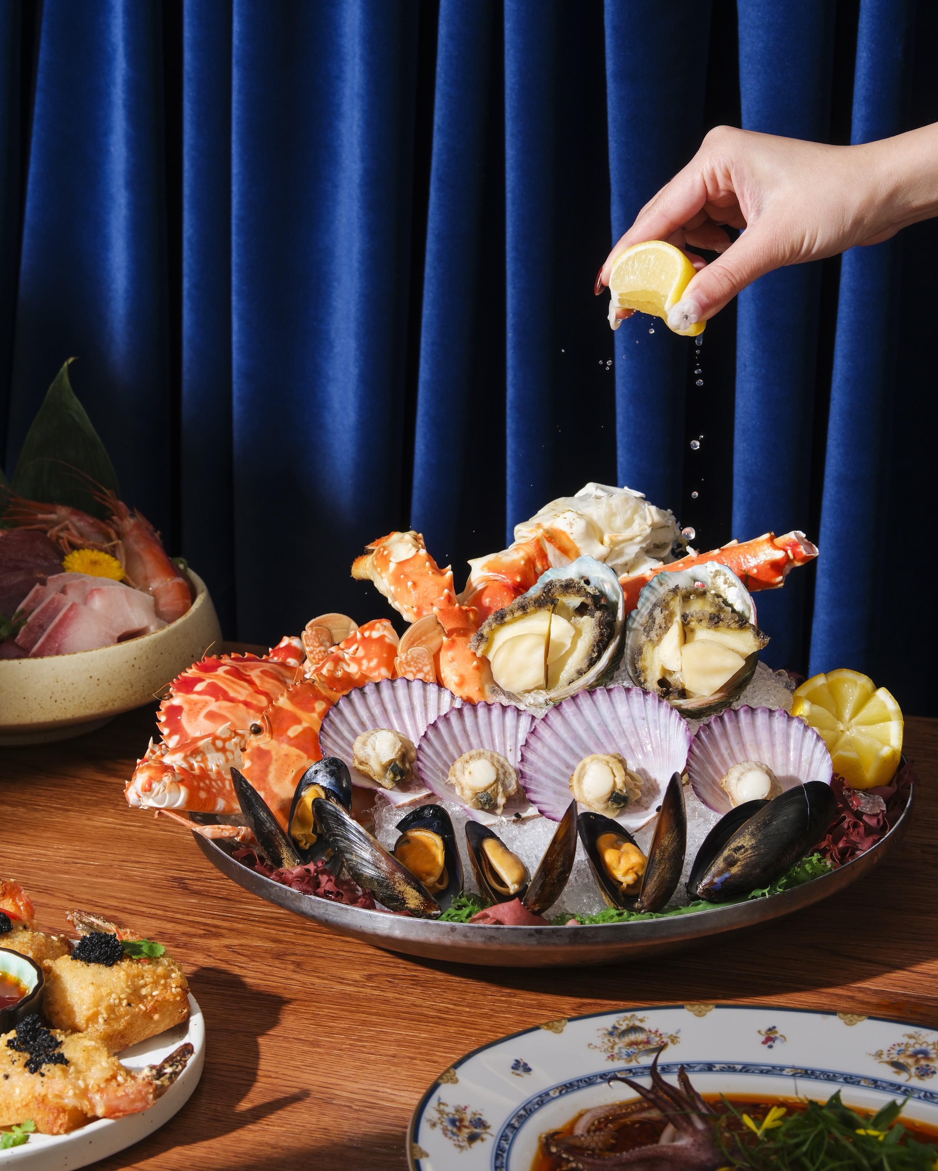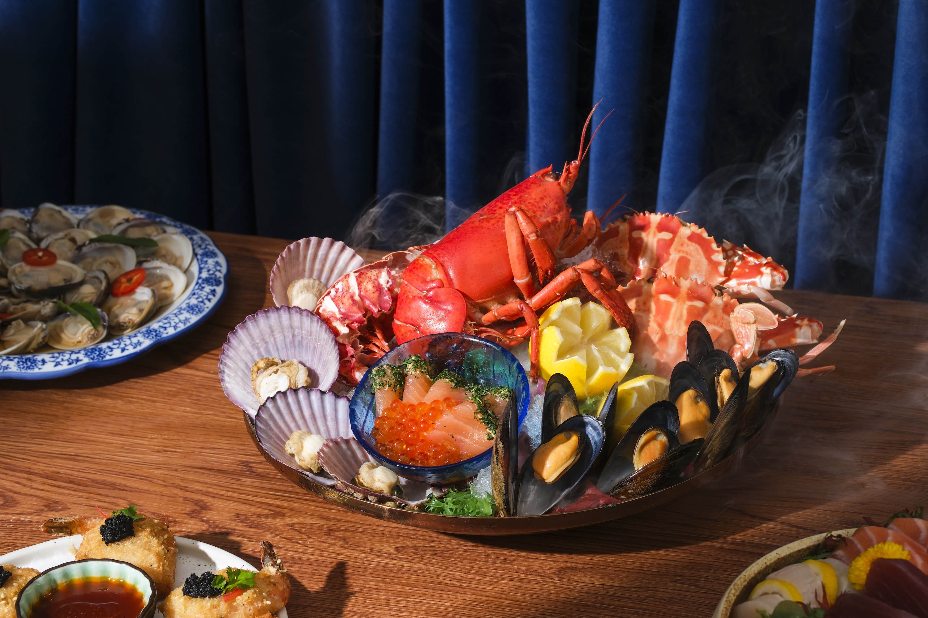 最令人期待的莫過於全新升級的豐盛海鮮拼盤,是次特別引入韓國直送頂級海鮮,嚴選珍稀食材,品質卓越。莞島以優質鮑魚聞名,當地海域清澈純淨、水溫適中,孕育出肉質爽彈、鮮甜甘美的頂級鮑魚;韓國扇貝及青口則以飽滿厚實的肉質深受饕客讚賞。平日精選涵蓋龍蝦、韓國扇貝、韓國青口、凍三點蟹及醃香草三文魚;逢星期五至日、公眾假期及其前夕更隆重升級,獻上皇帝蟹腳、凍三點蟹、韓國扇貝、韓國青口及韓國莞島鮑魚,珍稀食材以最鮮活的姿態呈現眼前。日式刺身區無限量供應包括帶子(逢星期五至日、公眾假期及其前夕供應)、阿根廷紅蝦(逢星期一至四供應)及油甘魚等時令刺身;冰鎮海鮮區則繼續呈獻龍蝦(逢星期五至日、公眾假期及其前夕供應)、長腳蟹、麵包蟹(逢星期一至四供應)、藍青口及大蝦等,以及無限量供應三文魚籽,讓您在琳瑯滿目的海洋珍饈中,恣意享受極致鮮甜的味覺盛宴。
