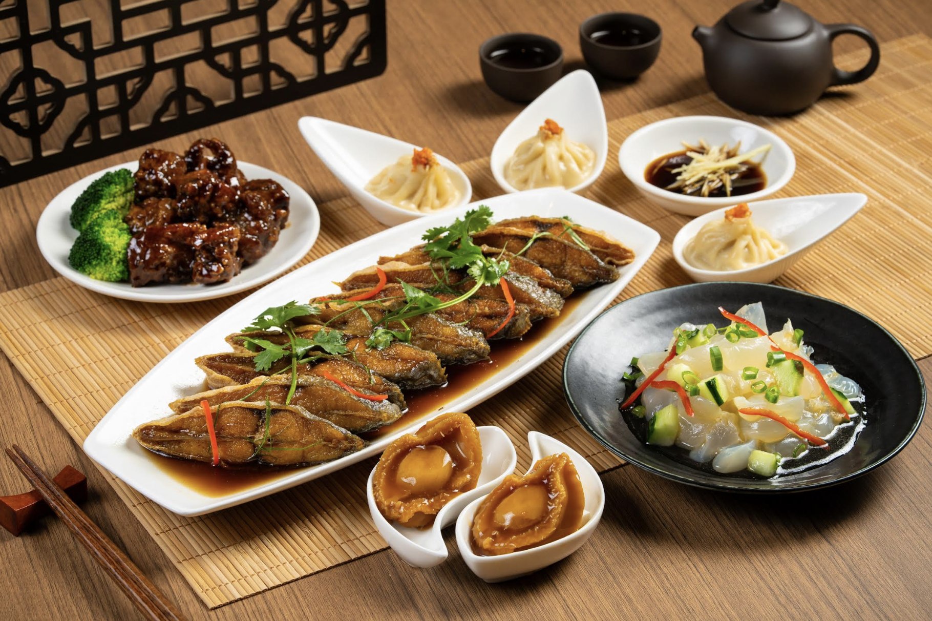 精選美食 上乘刺身 - 三文魚籽, 日本油甘魚, 阿根廷紅蝦, 赤貝, 吞拿魚 冰鎮海鮮 - 海蝦, 藍青口, 紐西蘭青口, 翡翠螺 農曆新年限定 - 橫財就手 (南乳炆豬手), 鴻運當頭 (紅燒獅子頭), 年年有餘 (甜酸炸銀花魚), 滿獎金錢 (蠔皇冬菇炆鴨掌), 嘻哈大笑 (蜜豆炒蝦仁), 發財好市大利湯, 甜蜜滿載 (特濃朱古力慕絲脆脆蛋糕), 福運連連 (雲呢拿士多啤梨慕絲蛋糕), 圓滿幸福 (椰香芋圓雪燕糖水) 環球美饌 - 鮑魚滑雞粥, 紅酒燴牛尾, 雜錦天婦羅, 蒲燒鰻魚, 雞軟骨串, 雞腎串, 章魚燒, 龍蝦湯, 擔擔麵, 馬來叻沙 甜美終章 - 意式芝士甜餅, 芒果班蘭戚風蛋糕, 榴槤慕絲蛋糕, 榴槤雪媚娘, 芒果拿破崙, 豆腐花, 芝麻糊, 蓮蓉西米焗布甸, 椰汁桂花糕, 10款Mövenpick雪糕