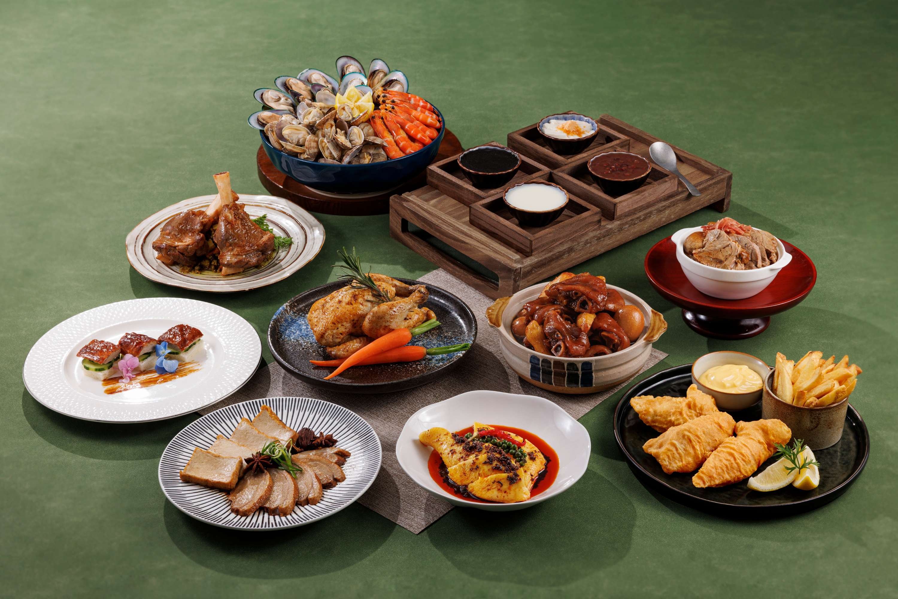 盡情品味華麗的海鮮盛宴, 東西風味交織融合, 鮮味與巧思相輝映, 呈獻一場極致難忘的時令饗宴 推介美食:生蠔,海鮮拼盤,酥皮海鮮龍蝦濃湯,紅棗杞子松茸野菌烏雞湯,蒙古孜然烤羊腿,威靈頓牛柳,避風塘炒蟹配蒜香蛋黃醬,迷迭香烤春雞,蒜蓉粉絲蒸元貝,金蒜蒸鮮魷,薑蔥蒸斑柳,川式甜酸松子魚,檸檬吉士撻,芒果糯米芝士蛋糕,朱古力豆沙歌劇蛋糕,迷你朱古力心太軟,無限供應果汁、汽水、紅酒、白酒和啤酒