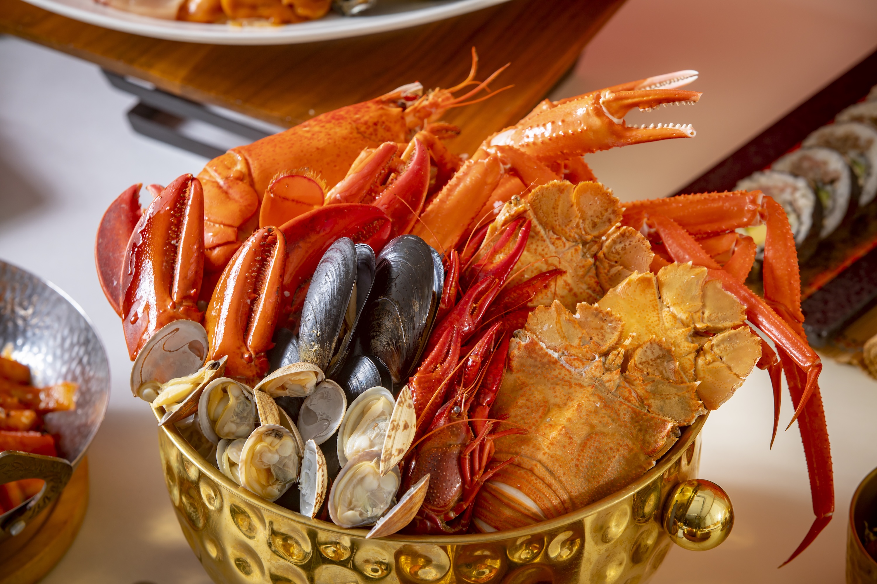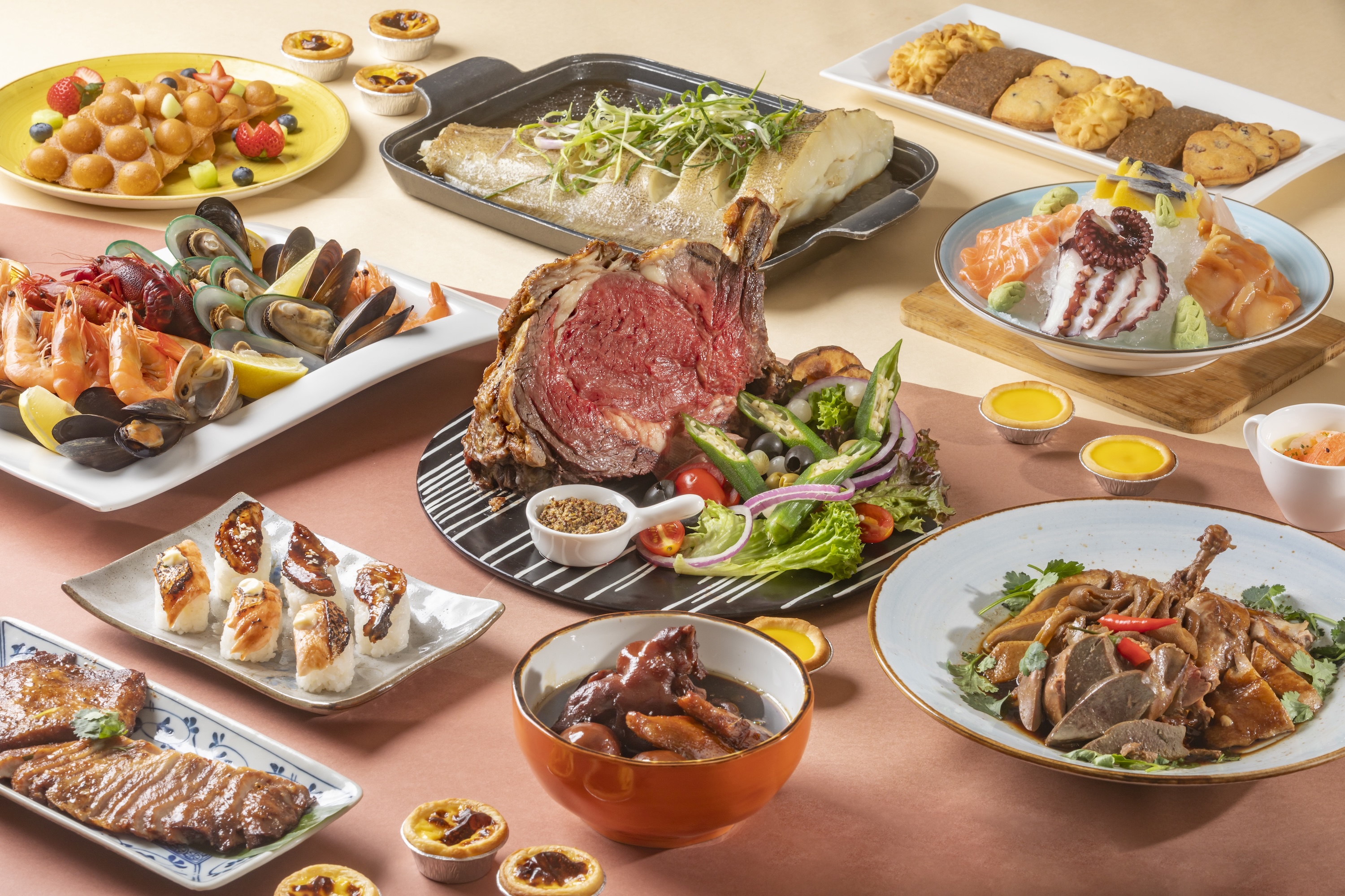 再臨閣自助午餐/假日自助午餐選擇包羅萬象,從冷熱盤到壽司刺身,再到季節性菜式,提供多元化的用餐選擇。精選熱食包括有骨西冷、豬腳薑、滷水拼盤、即燒豬頸肉、雲吞麵檔等。甜品方面,不可不試的有招牌即做雞蛋仔或窩夫、豆腐花、焦糖燉蛋和多款口味的 Häagen-Dazs 雪糕等。
