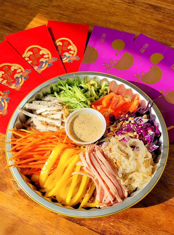 青瓜絲、甘荀絲、甜椒絲、椰菜絲、扎肉絲、火腿絲、海蜇絲,配花生、芝麻、炸乾蔥、芝麻醬