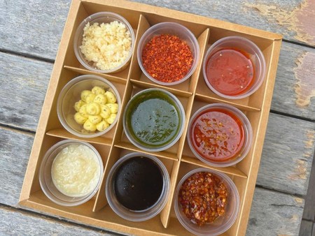 日燒鹽麴、秘製孜然辣粉、韓國燒肉汁、泰式酸辣汁、燒烤醬、生蒜蓉、海鮮燒烤醬(自家製)、牛油、自家製沙嗲醬